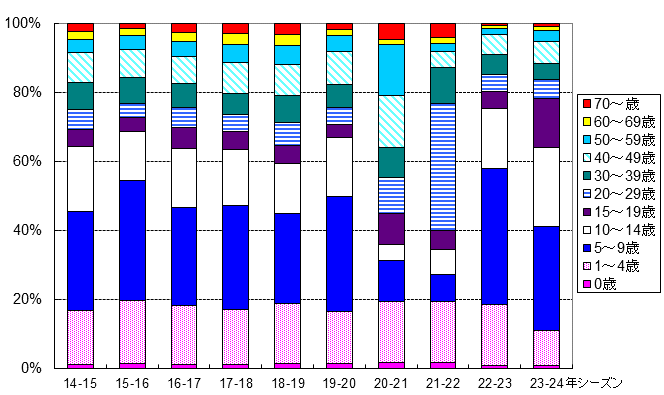 (資料)東京都感染症情報センター「過去10シーズンの年齢階級別患者報告割合の推移(2014~2024年)」